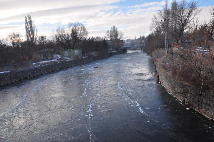 Kentte etkili olan soğuklar, yaşamı olumsuz etkiliyor. Hava sıcaklığı eksi 15 dereceye kadar düşerken, tarihi kalenin eteklerinden geçen Kars Çayı kısmen dondu. Allahuekber Dağları'ndan doğan, kent merkezinden geçen çayın yüzeyi buzla kaplandı.